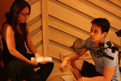Our audio engineer Philip in front of the console and our Tuldok producer Ramon, also the director of another animated folktales project entitled "Catalina of Dumaguete," as seen from the monitor at the recording side of the studio. Yes, the monitor is right above a piano. :)